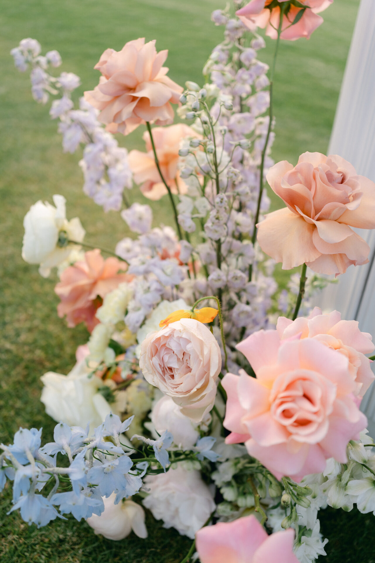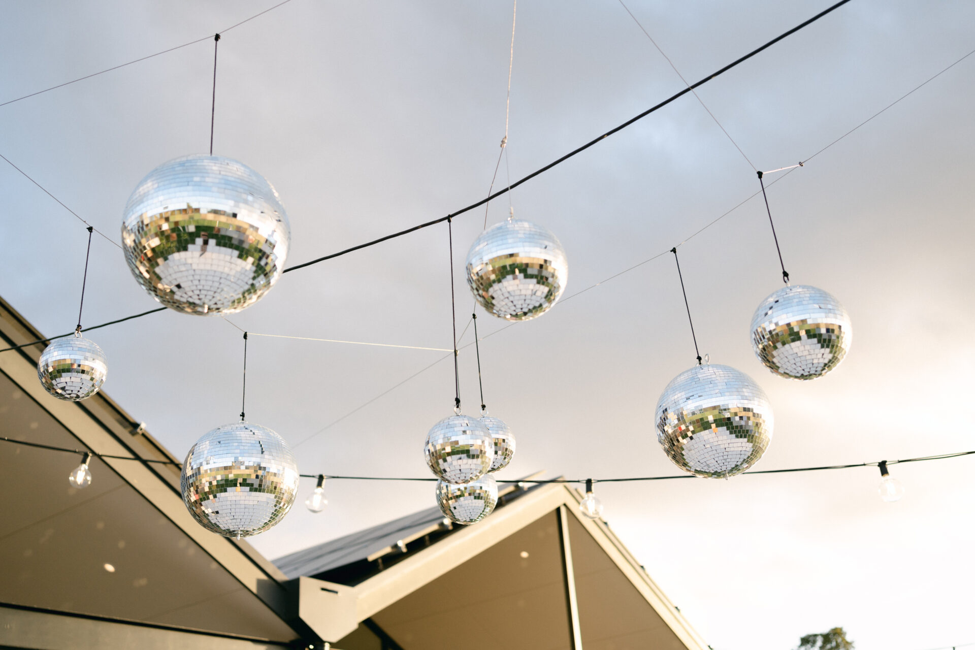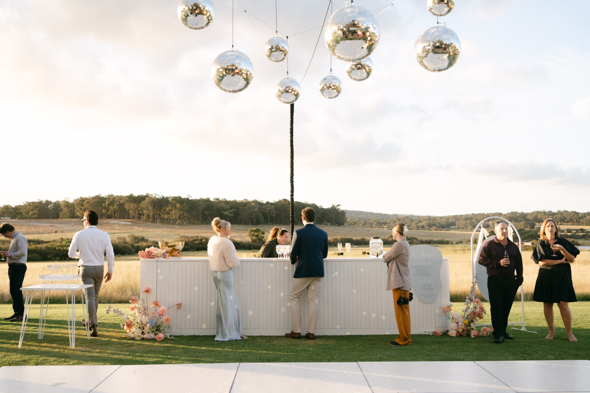 Their vision was a “relaxed garden party” with an all-outdoor, cocktail-style wedding that allowed guests to mingle freely and dance the night away. Instead of formal seating, they opted for textured white furniture, a beautiful white dance floor, festoon lighting, and disco balls for a luxe yet personal touch. By repurposing ceremony florals for the bar, they struck the perfect balance of simplicity and elegance without overspending on decor.