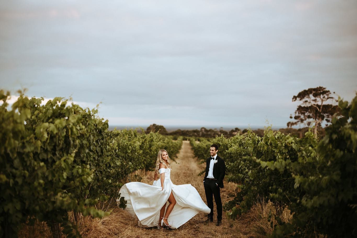 Photos by: James Simmons (bride & groom vineyard, champagne pop & ceremony, pink bridesmaids, arch backdrop bridal table, hydrangea bride), Shannon Stent (happily ever after neon x 2), Jonathan Chua Photography (barrel room)