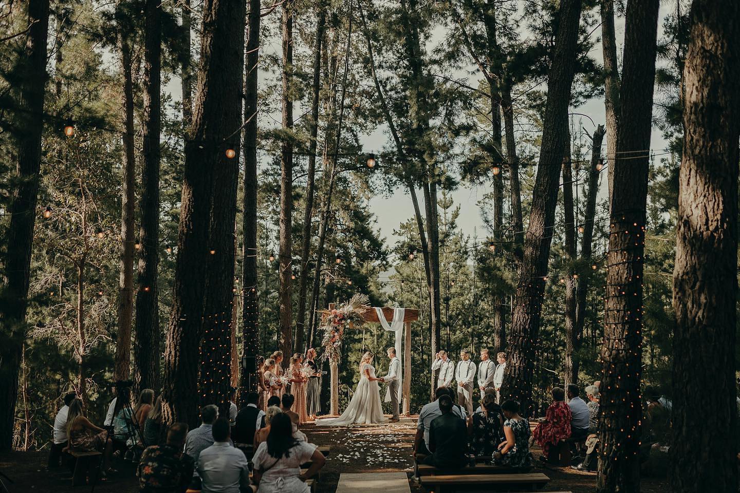 Photos by: Emma Macaulay (bride & groom at ceremony), Caroline Moylan Photographer (bride & groom coming up aisle), Riley White Photo (forest ceremony), Kitty Loves Love (bride & groom close up celebration)