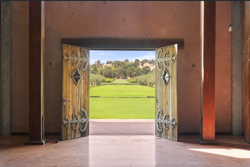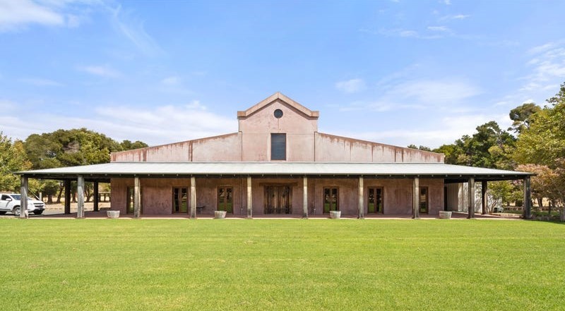 This unique Mediterranean-style barn is surrounded by expansive lawns, a tranquil olive grove, vineyards, and paddocks, offering endless picturesque backdrops.