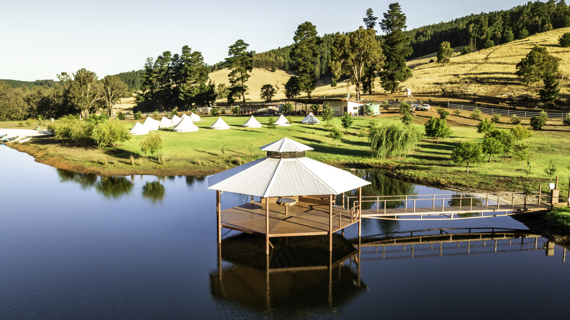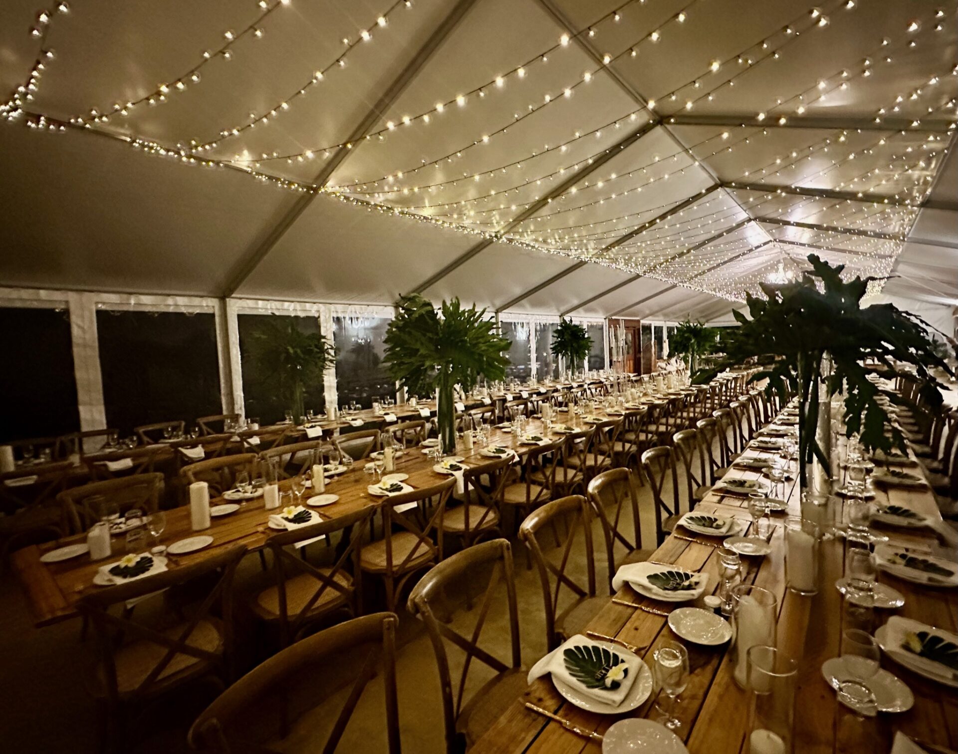Our marquee, with its clear walls, offers panoramic views of the beautiful lake and surrounding hills. It provides a perfect setting for your celebration, blending seamlessly with the natural beauty of our Estate.