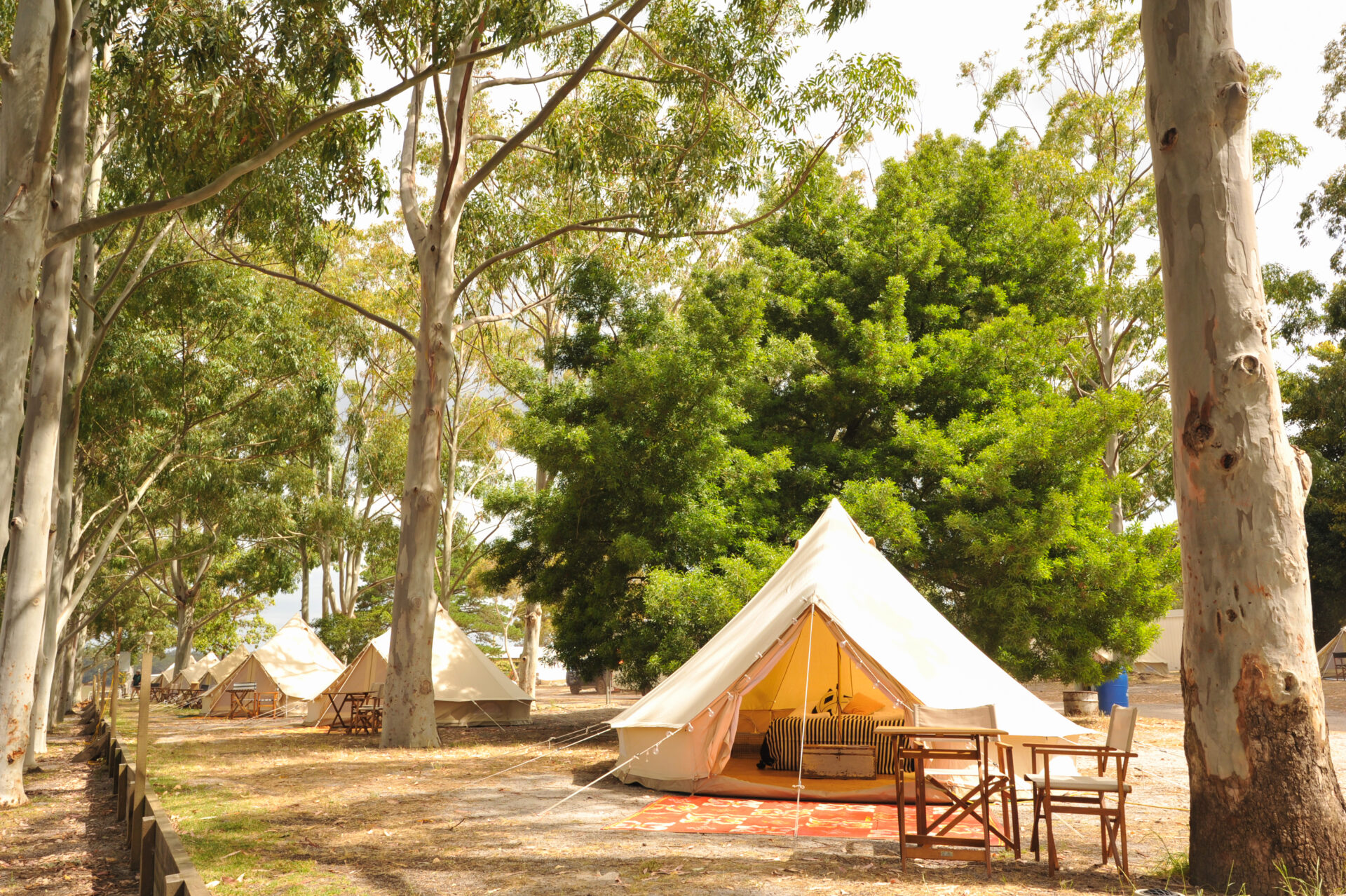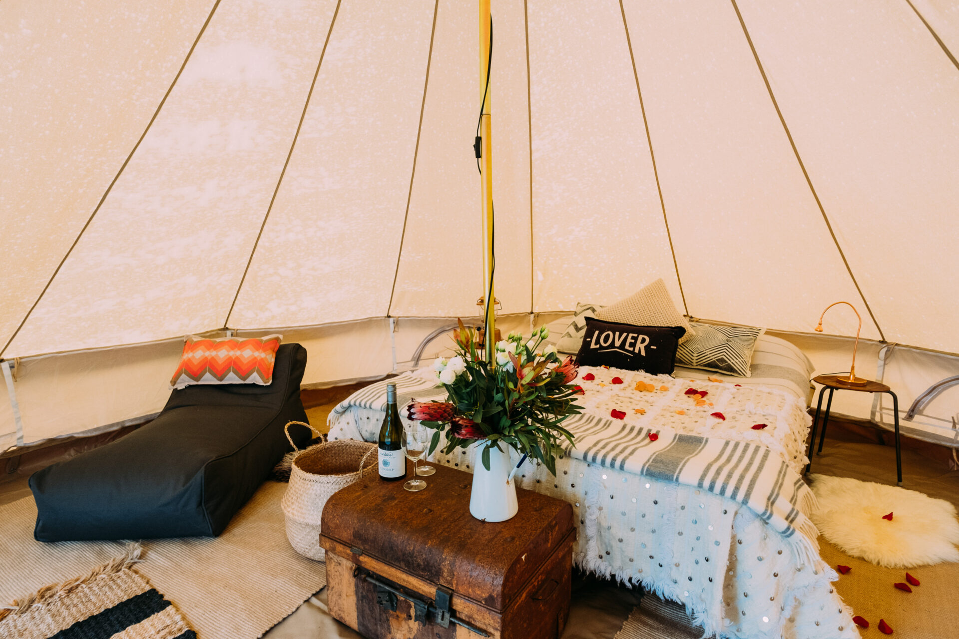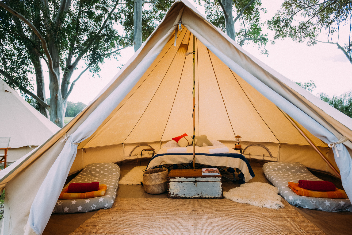 Our elegant canvas bell tents are thoughtfully furnished with queen or single mattresses, pillows, duvets, crisp white linens, blankets, jute rugs, sheepskins, cushions, towels, and string lights to create a cozy and inviting space.
